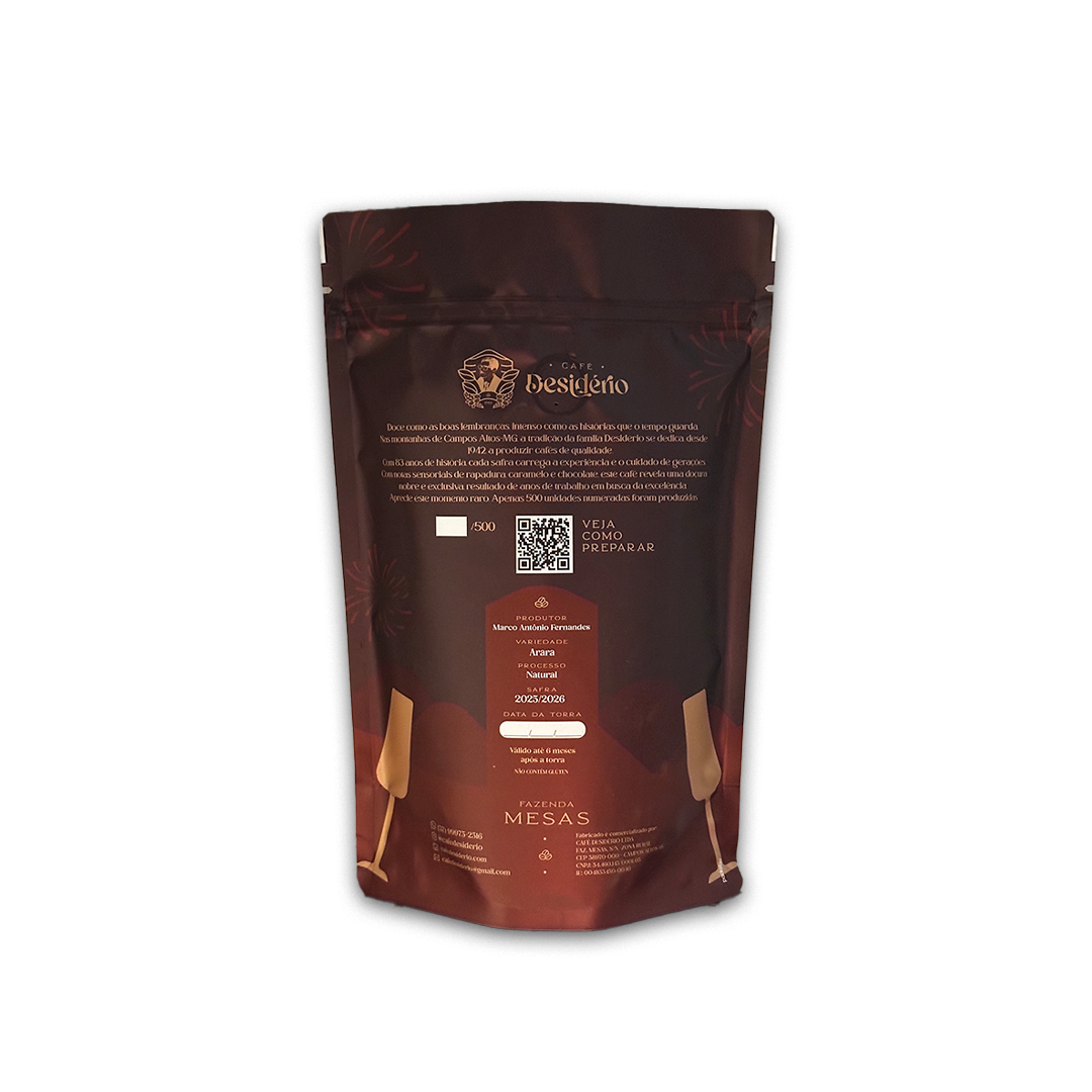 Com 500 unidades numeradas, em uma edição limitada e totalmente especial, o Café Desidério perfil rapadura nasce do melhor da nossa fazenda em Campos Altos, colhido e selecionado com rigor e torrado com precisão para entregar um sabor único: encorpado, adocicado, suave, sem amargor e com aquela nota marcante de rapadura que aquece como noite de Natal.